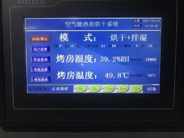 步驟二:新鮮山楂片的含水率約為80%,干燥的目標含水率約為13%,使用空氣能熱泵型烘干機,將智能溫度設(shè)定為55攝氏度左右的范圍,使山楂片所含的游離水大量蒸發(fā),熱風循環(huán)系統(tǒng)不斷輸送新風,將風量均勻的輸送至各層架,排風,促使蒸發(fā)的水份通過凝結(jié)水管路系統(tǒng)排出。